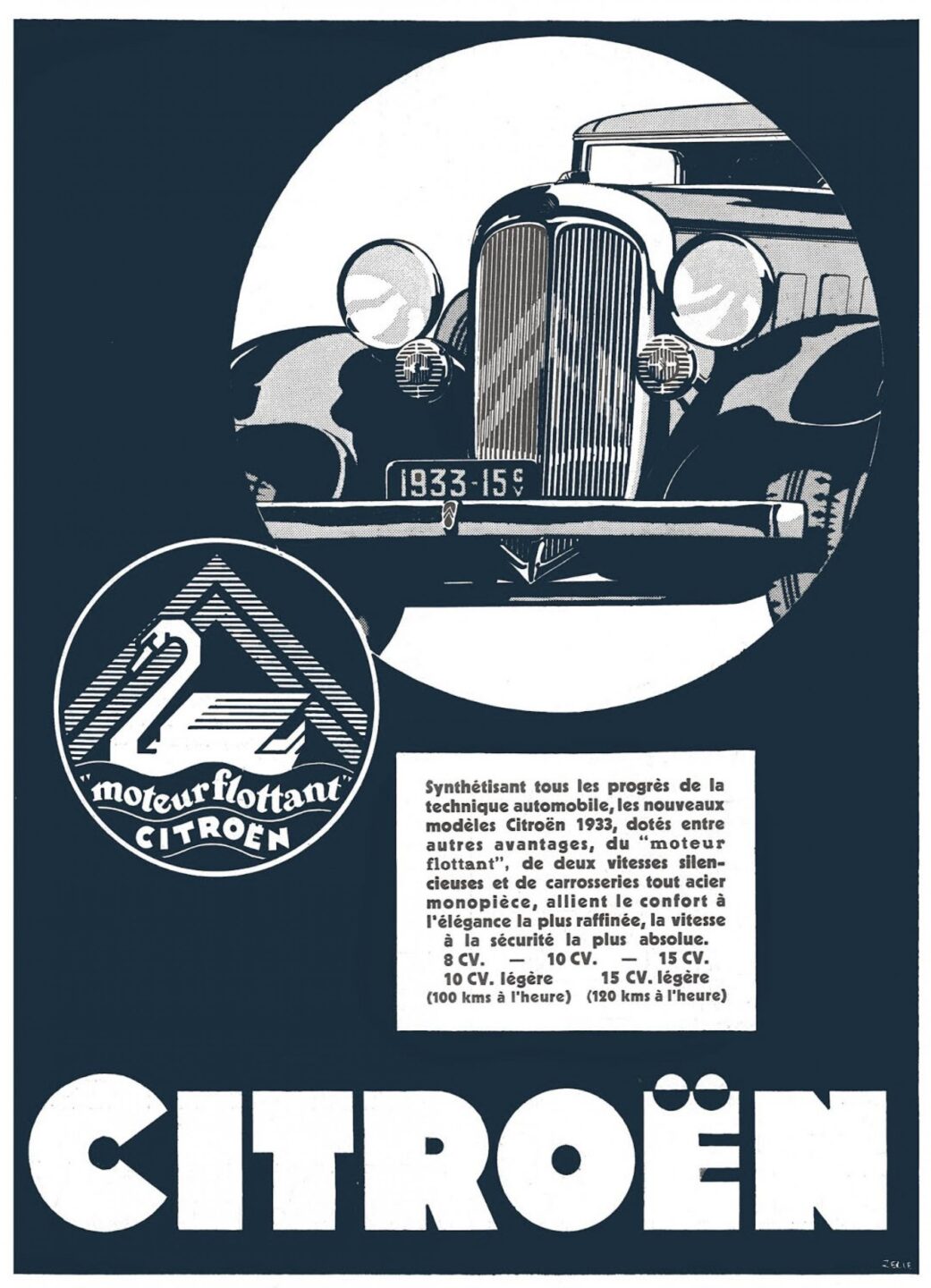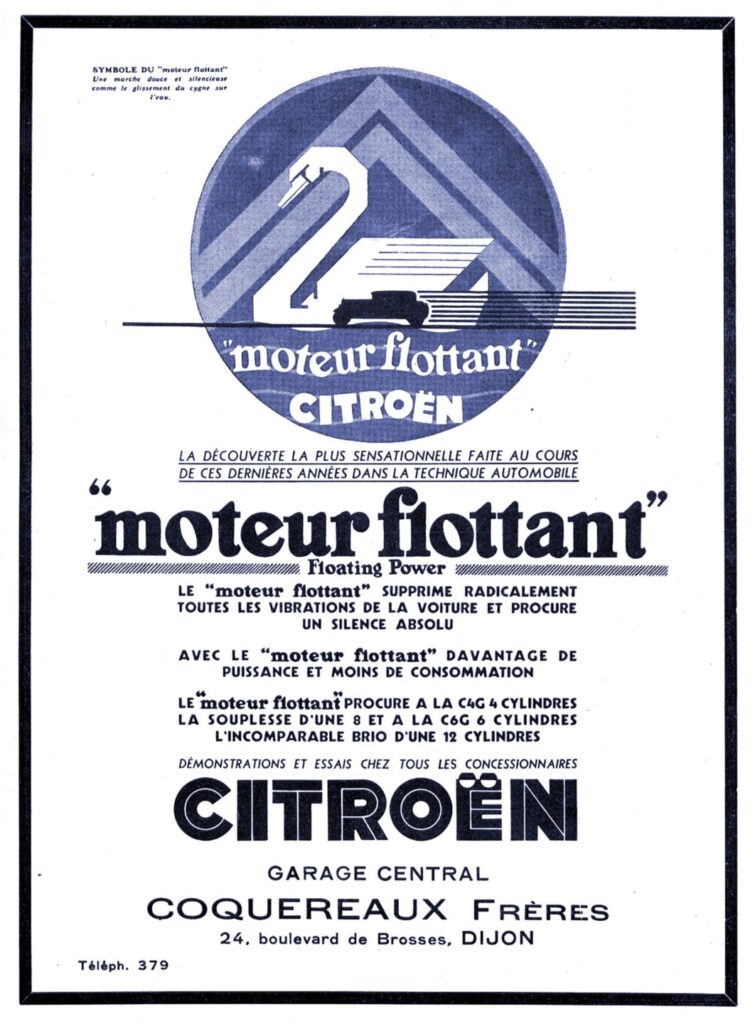 Para subrayar todavía más la diferencia entre los confortables y silenciosos Citroën y el resto de los vehículos en circulación en Francia, se desarrolló una campaña publicitaria de gran impacto completada con un informe con documentación clara y convincente que se repartió entre la red de ventas, todo ello apoyado por un elemento añadido: un emblema, un símbolo evocador y fácilmente reconocible que identificaba la Marca con el motor flotante.
