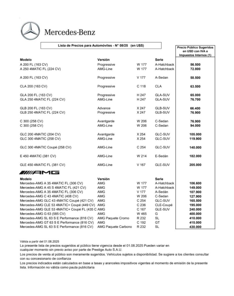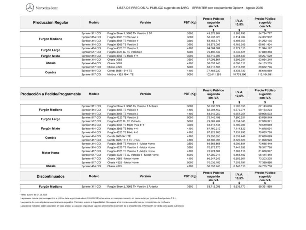 Luego de haber anunciado en junio una reducción en los precios de la Sprinter, Prestige Auto reafirma su estrategia comercial, la cual incluye no realizar aumentos en sus vehículos durante agosto. De esta manera, la lista de precios sugeridos al público —tanto para los vehículos importados como para la Sprinter fabricada localmente— se mantiene sin modificaciones respecto a junio. Por otra parte, con una participación superior al 60% en el mercado de utilitarios en Argentina, la Sprinter se posicionó como líder en patentamientos el pasado mes de julio.